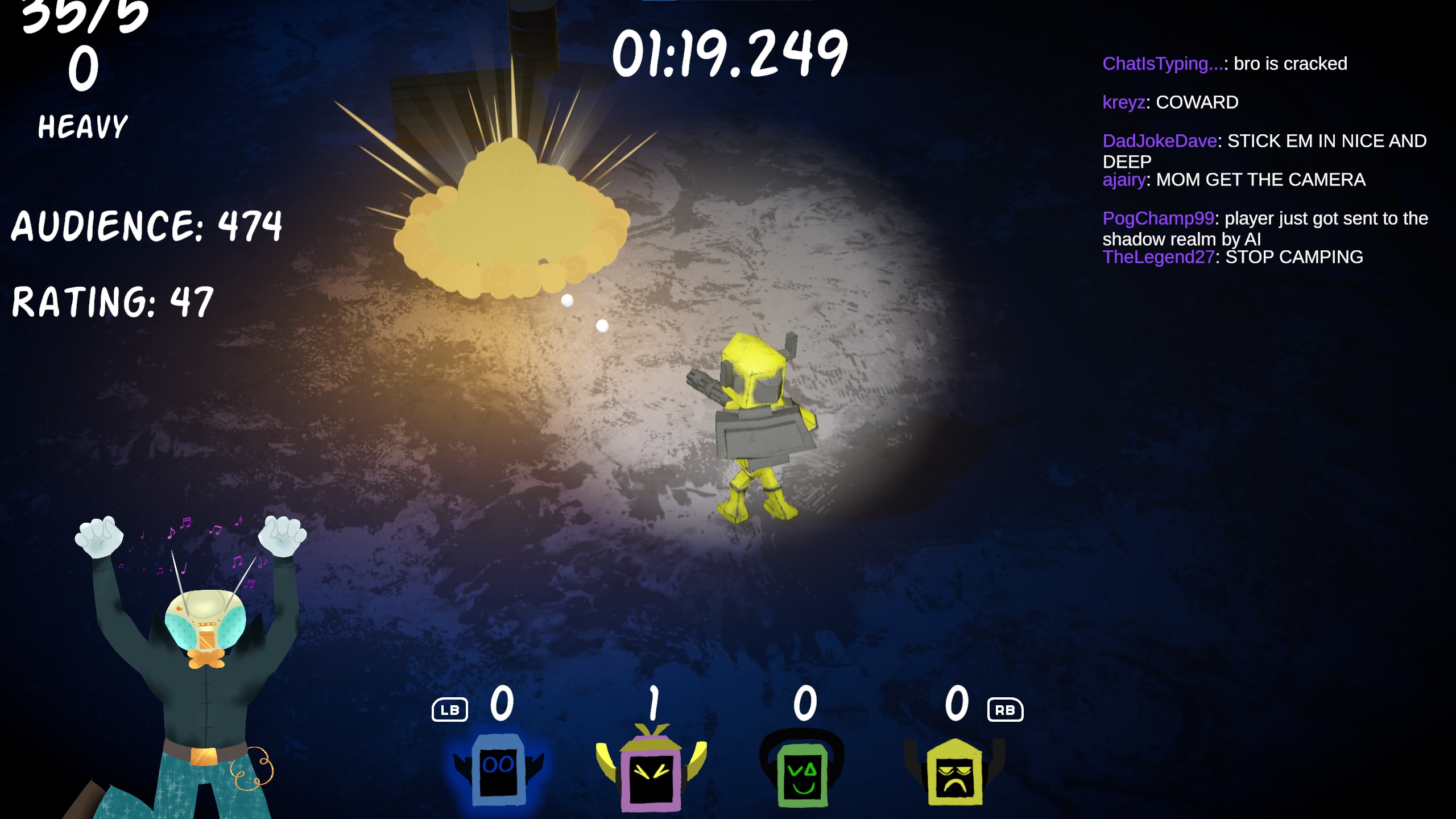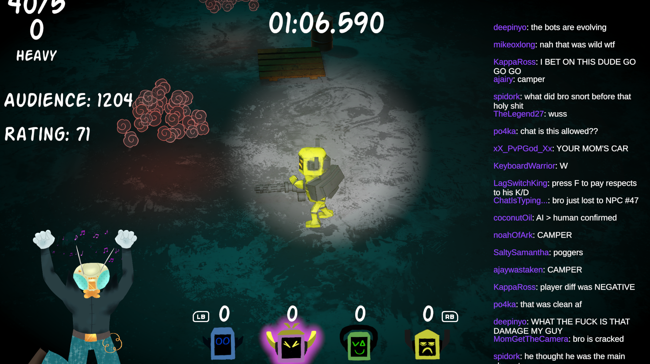 Join us in a game-meets-reality show made for WSF Game Jam 2025 - play as one of four robots, each with a simple attack and a special skill. The live audience wants to see you get the high score, but at the same time they don't want the show to be boring. "Camp" as one bot too long and your rating will plummet!